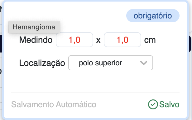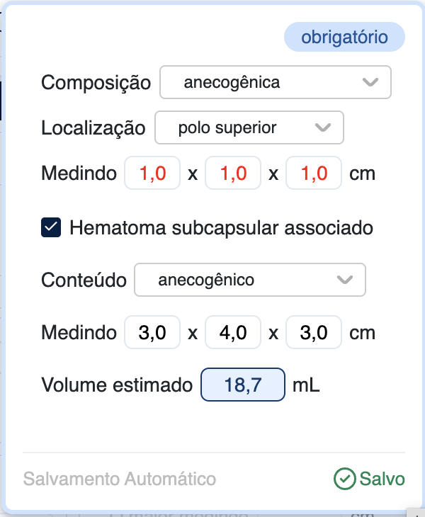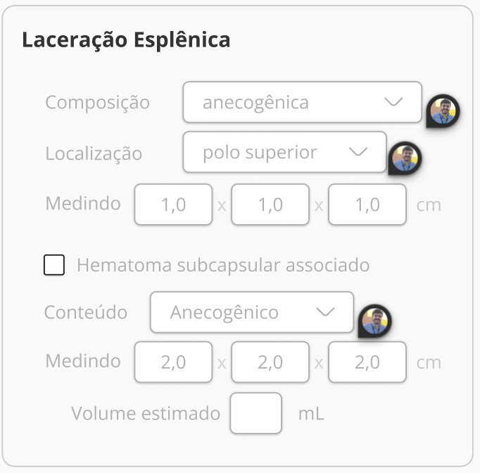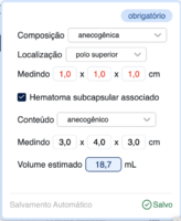 O Layout também está faltando as opções do "hematoma subcapsular associado". Lembrando que as opções de caixa de seleção também estão no figma e as pré-selecionadas são essas do print.