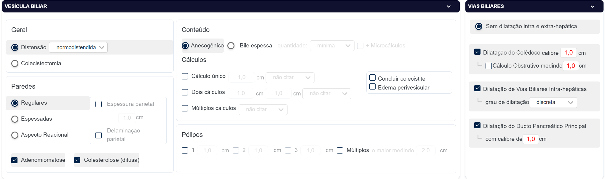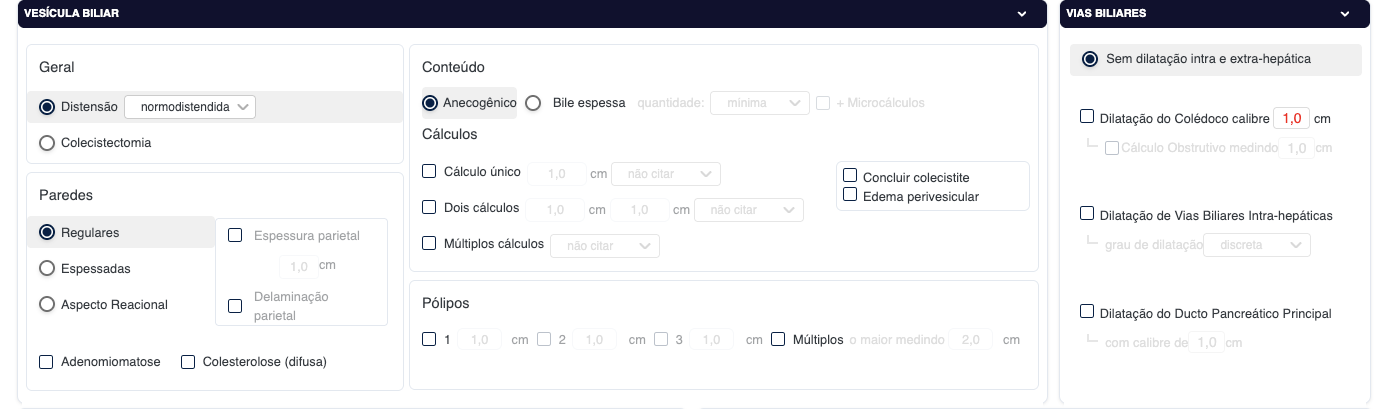Vias biliares: precisamos estabelecer um circuito fechado: ou o botão round "sem dilatação das vias biliares" fica habilitado ou um ou mais dos três checkboxes ficam habilitados.