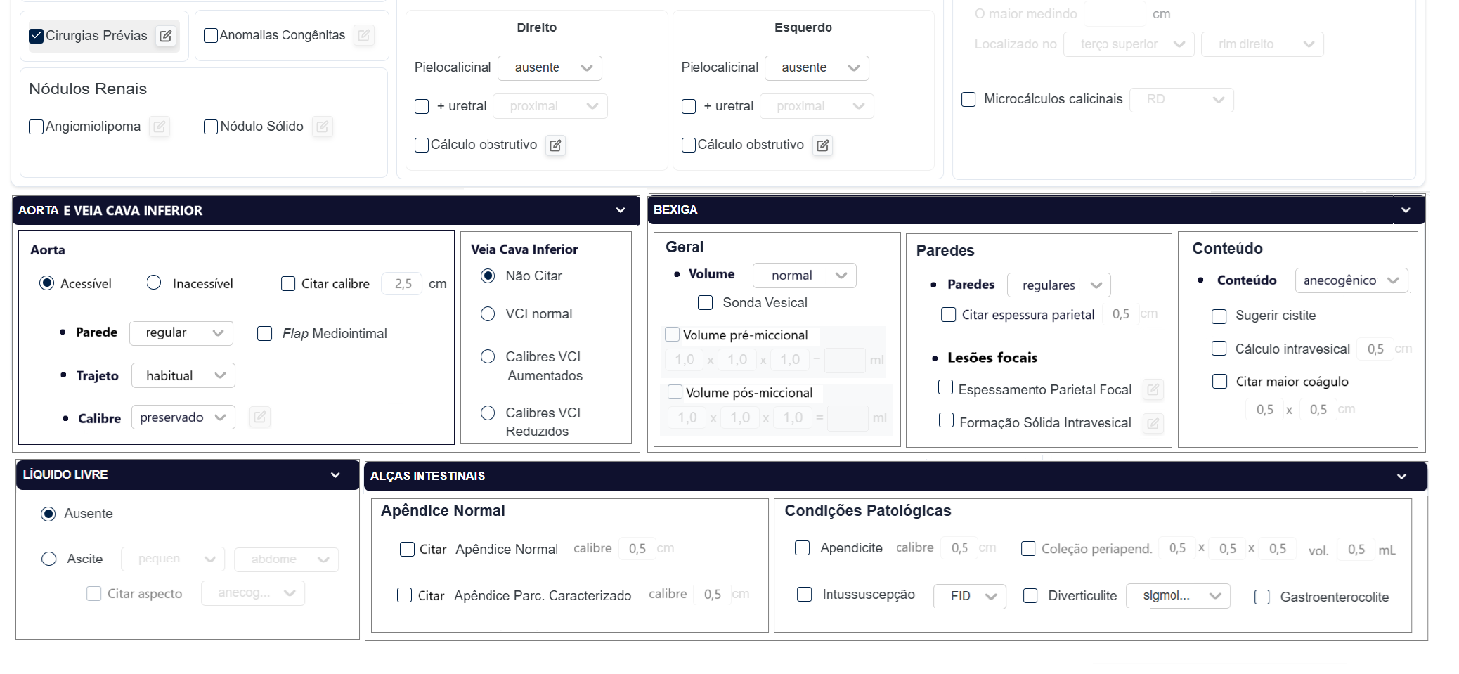 Os checkbox "sugerir cistite" e "cálculo intravesical" podem ser marcados com qualquer opção