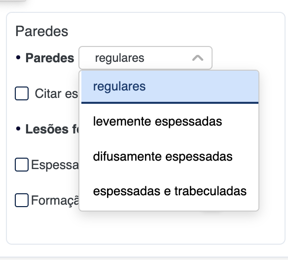 Paredes: regulares / levemente espessadas / difusamente espessadas / espessadas e trabeculadas