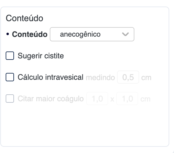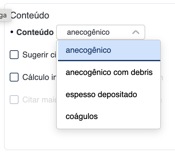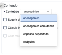 Caixa de seleção: anecogênico / anecogênico com debris / espesso / coágulos