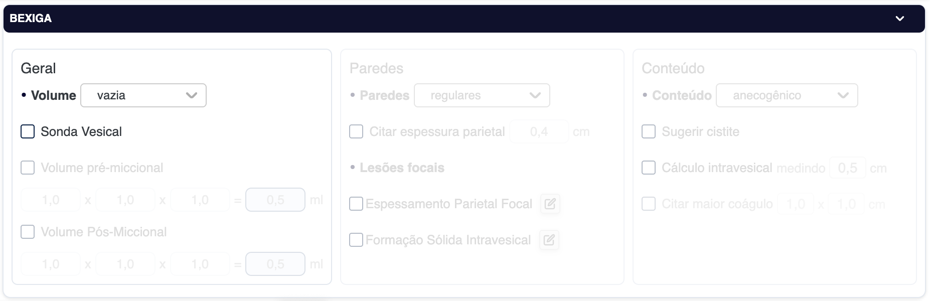 Caixa de seleção: normal / pequena repleção / vazia / bexigoma