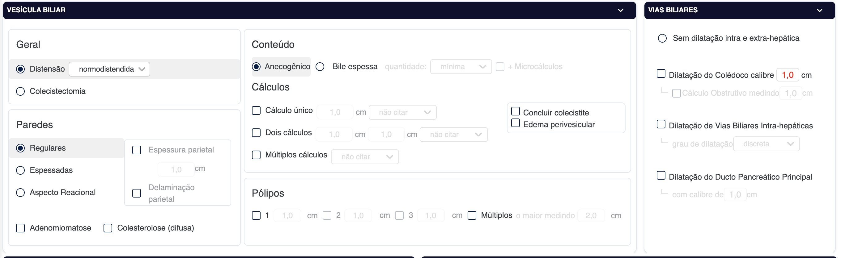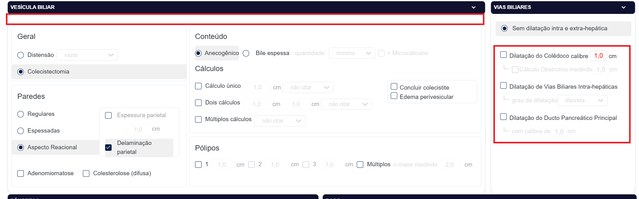 Percebi um espaçamento maior do que o normal no início.. além disso as opções de "vias biliares" poderiam ter um espaçamento um pouco maior para não ficar a sensação de espaço vazio (não precisa chegar até o final, mas aumentar uns 50% o espaçamento entre as opções já ajuda)