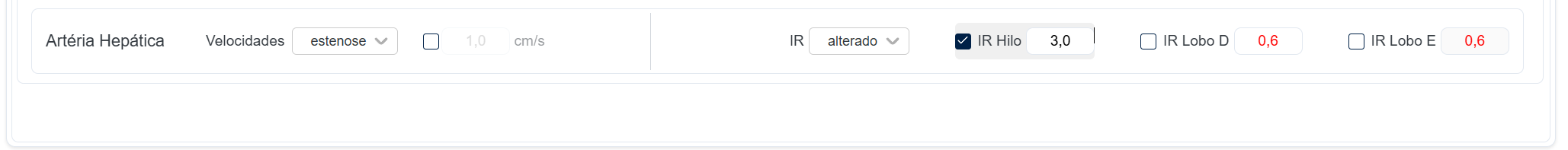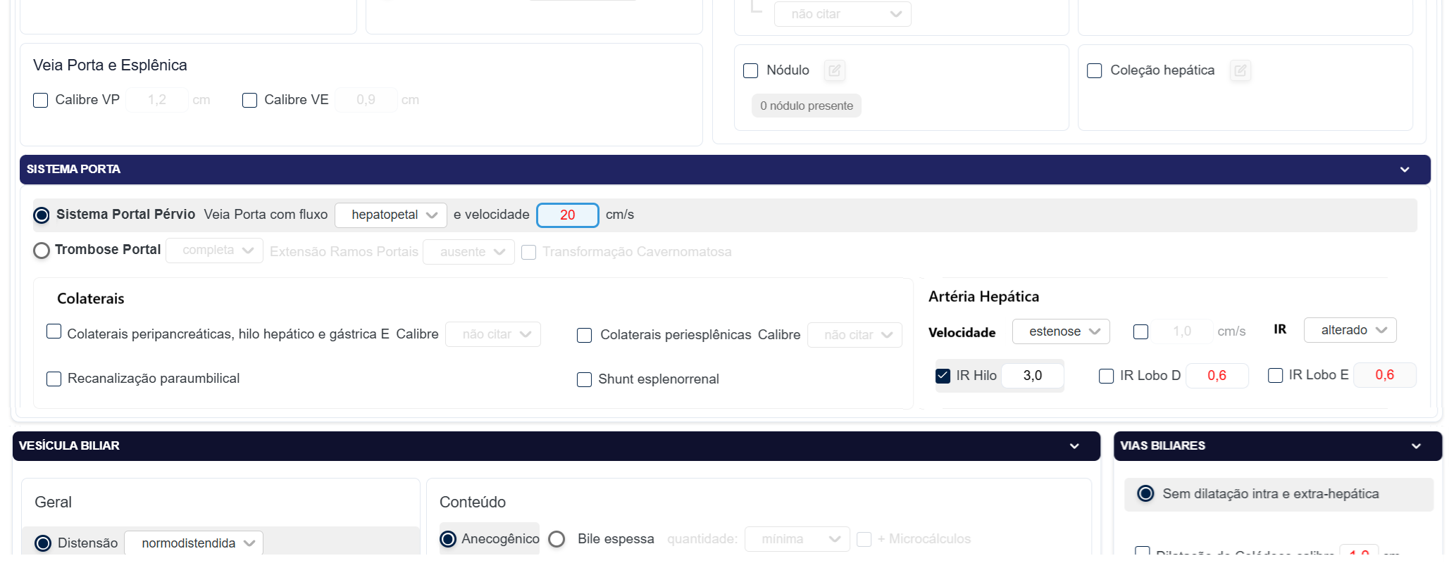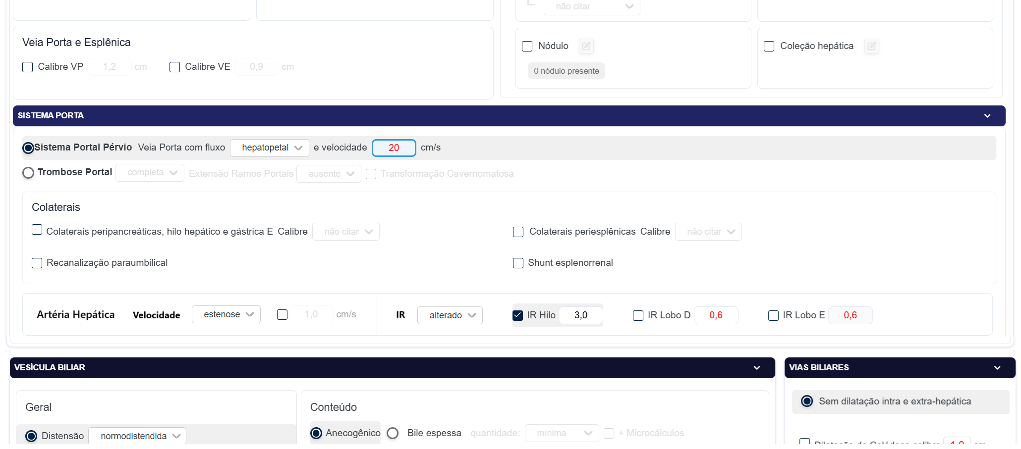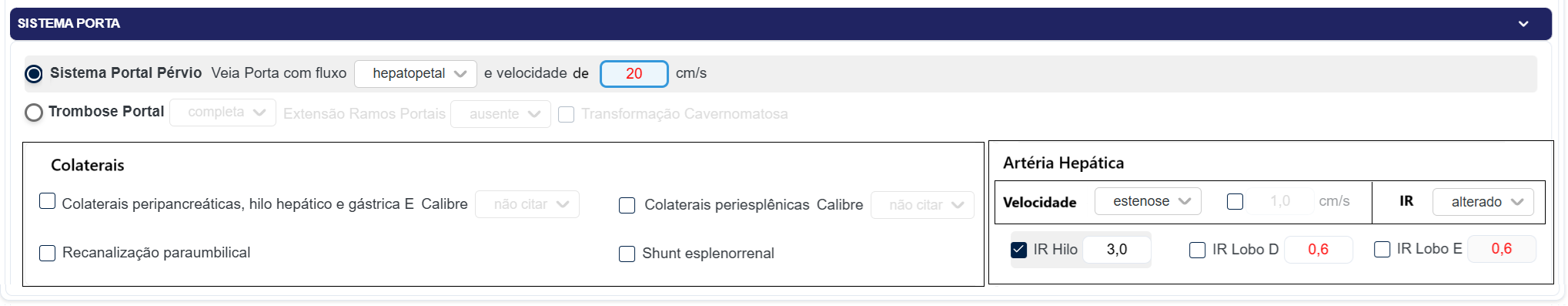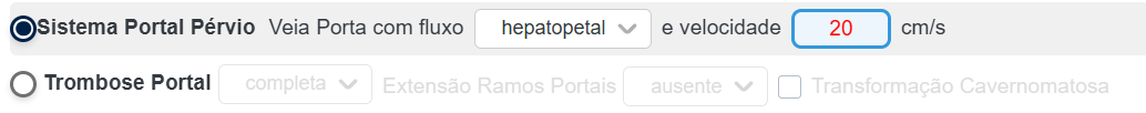 - Sistema portal pérvio - veia porta com fluxo (caixa de seleção) e velocidade de (input numérico) cm/s
