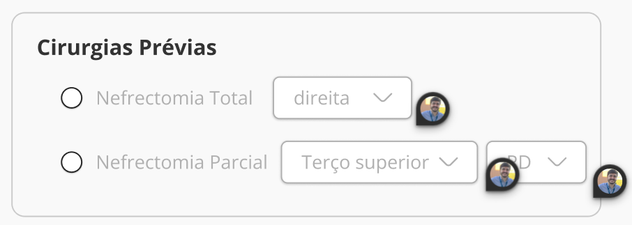 Caixa de seleção nefrectomia parcial: terço superior/ terço médio / terço inferior + RD / RE