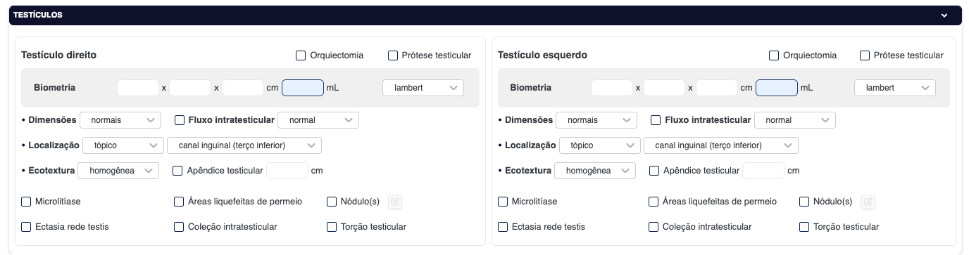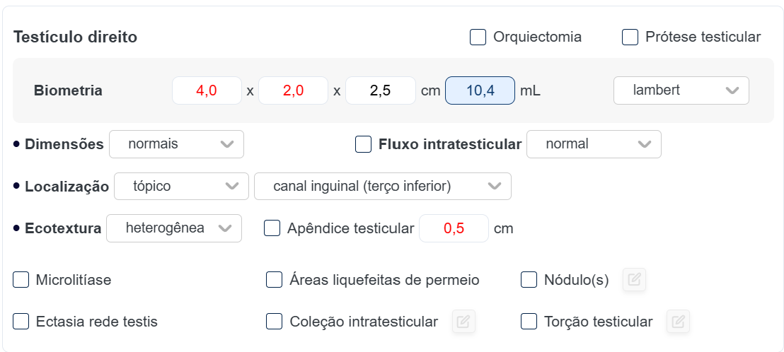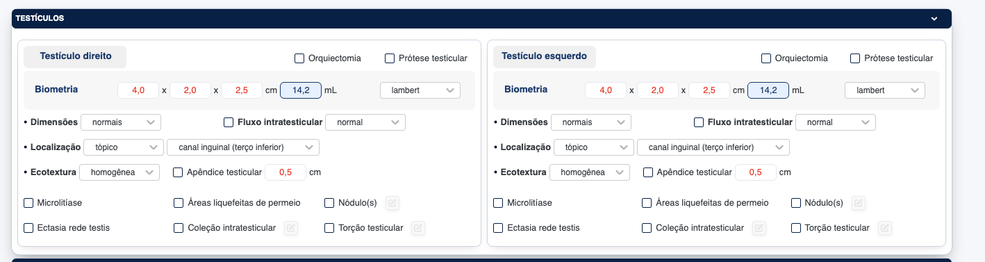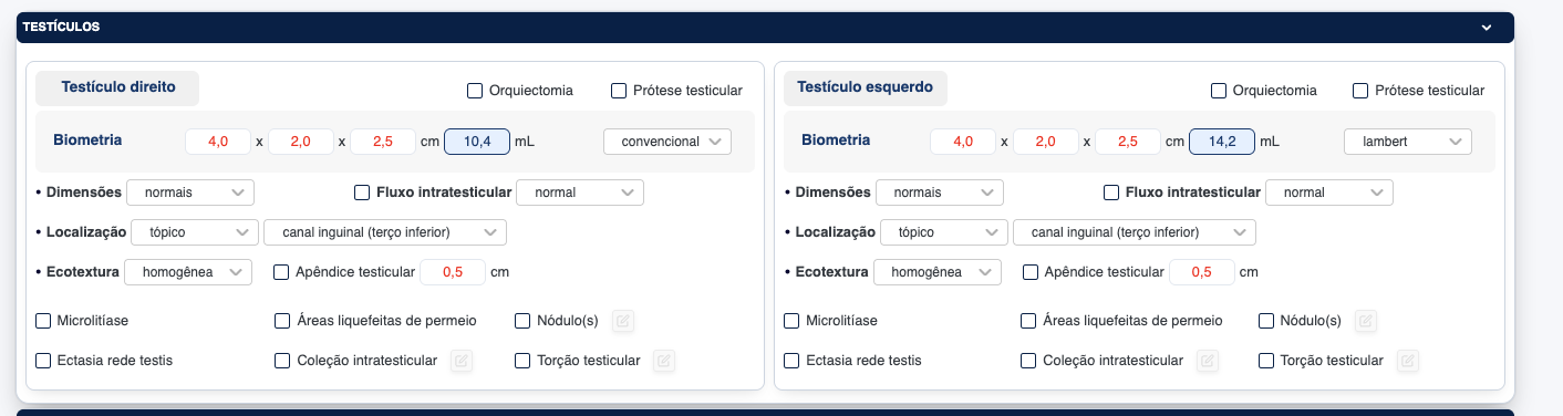 - Uma questão aqui foi em relação as fórmulas de cálculo (lambert e convencional), que ficam na caixa de seleção ao lado das dimensões testiculares.