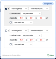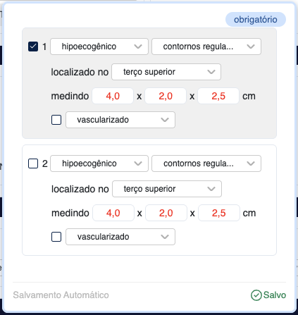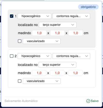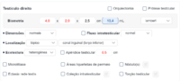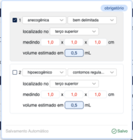 - Ajustar as medidas padrão do popover de "Nódulos" e "Coleção intratesticular" para 1,0 cm em todos os campos