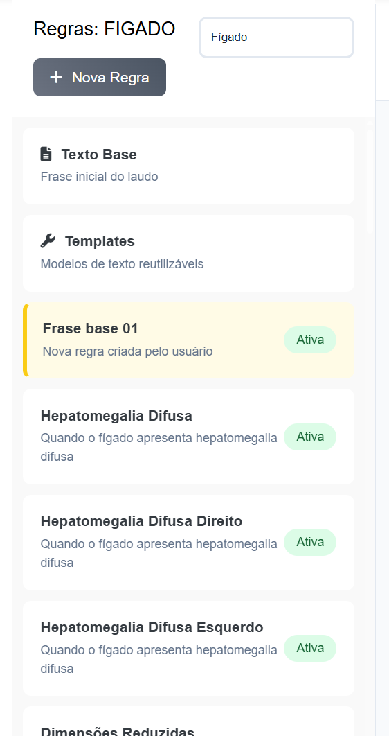 - Nossas conclusões são geradas automaticamente nas frases, mas, ao final de todas as regras, também pensei em criar um último tópico amarelo com a "conclusão base". Essa conclusão base seria gerada no caso de um exame 100% normal, que não seria inserida nenhuma outra conclusão pelas regras. Por exemplo no abdome, a conclusão base seria "Ultrassonografia do abdome total sem alterações." No caso de qualquer conclusão ser inserida pelas regras, essa conclusão seria deletada e daria lugar às outras (mesmo que seja só uma) geradas pelas regras.