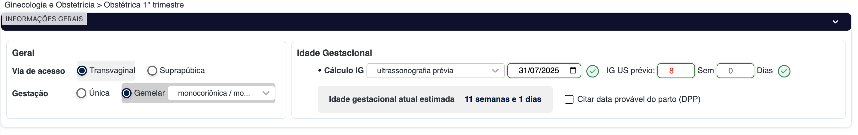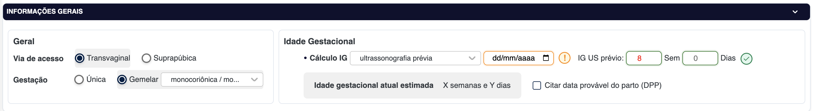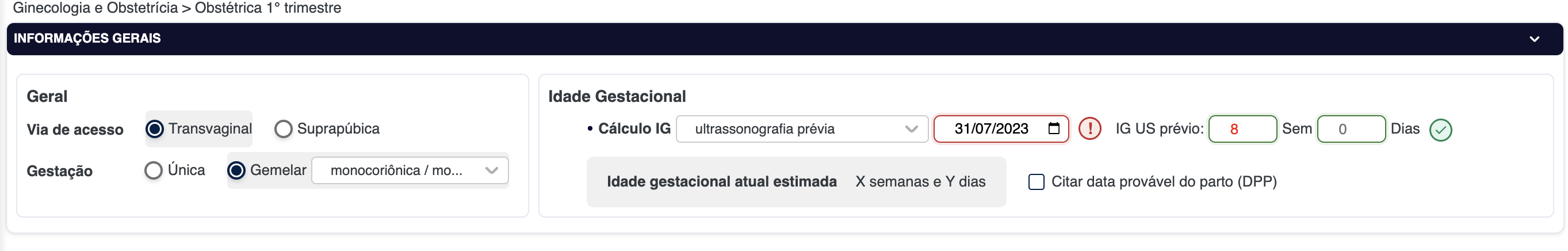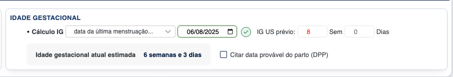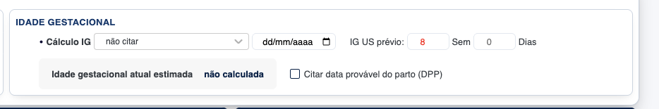 - na ausência de data pré-definida, a idade gestacional estimada retorna X semanas e Y dias. A ideia é que esse cálculo seja feito somente quando uma das opções "Data da última menstruação (DUM)" ou "ultrassonografia prévia" esteja selecionada. Caso esteja em "não citar" a ideia é retornar algo como "não calculada" para o usuário. Dessa forma não vamos abandonar essa questão de X semanas e Y dias
