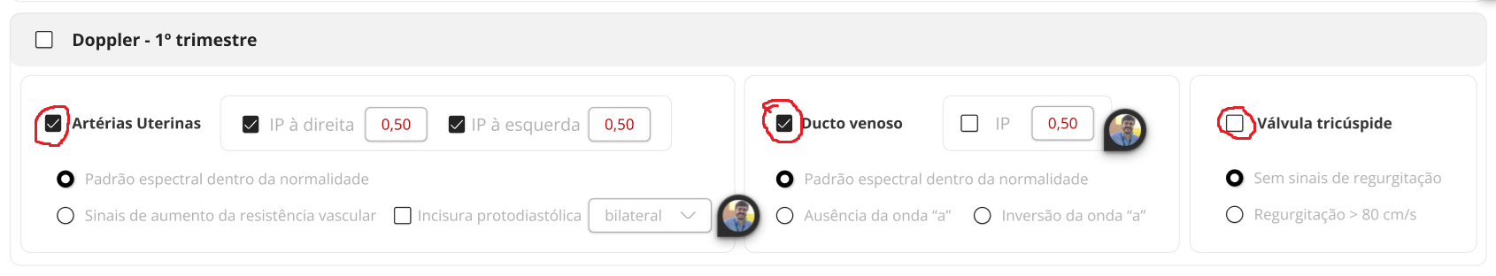 1. Por um erro de construção meu, faltaram uns checkboxes antes de "Artérias uterinas", "ducto venoso" e "válvula tricúspide". As duas primeiras já estão habilitadas de padrão. Ajustei no figma.