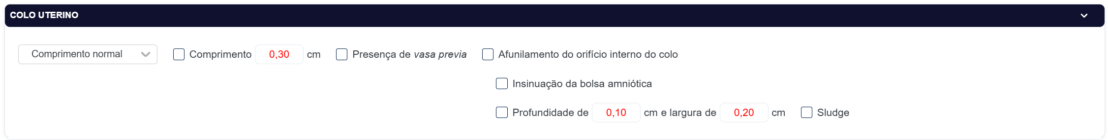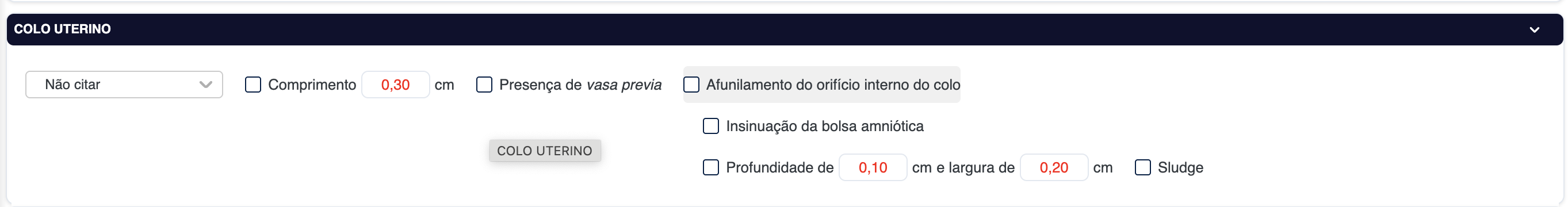 Vamos mudar a alternativa pré-estabelecida da caixa de seleção do colo uterino para "Comprimento normal". Ficará dessa forma: